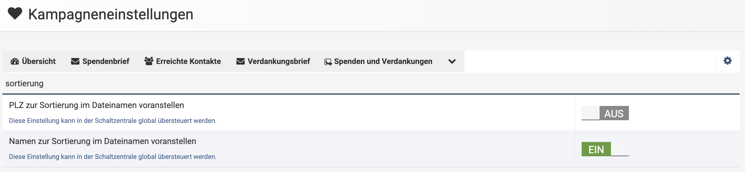Die Funktion können Sie in den Kampagneneinstellungen (vor der Erstellung der Briefe!) aktivieren. Alternativ lässt sich die Einstellung auch in der Schaltzentrale (Menü "Administration") festlegen. Sie gilt dann für alle Kampagnen.