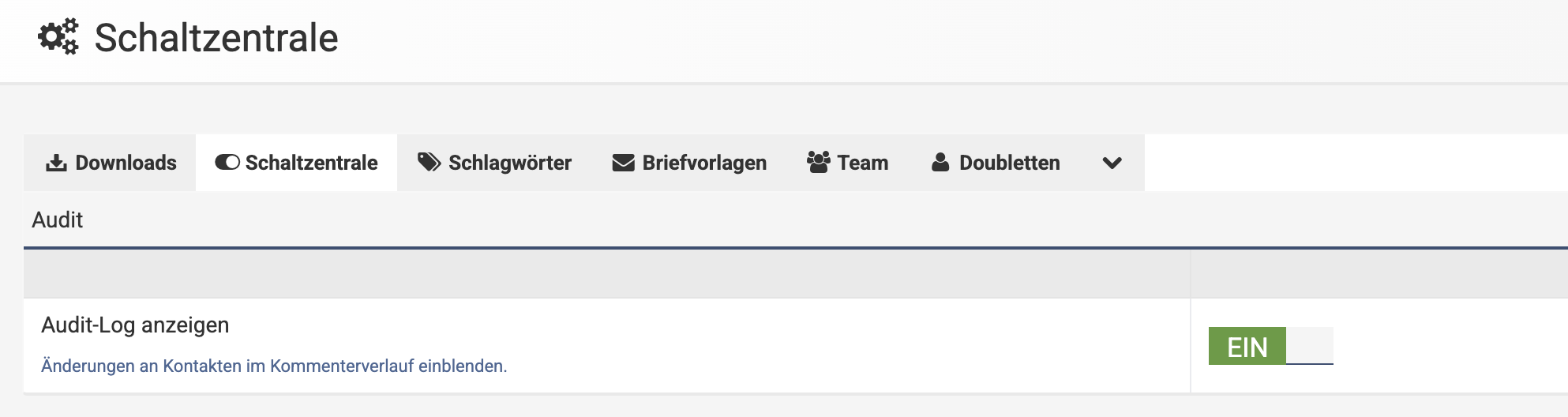 Um das Audit Log einzublenden, muss die entsprechende Funktion in der Schaltzentrale ("Administration") aktiviert werden: