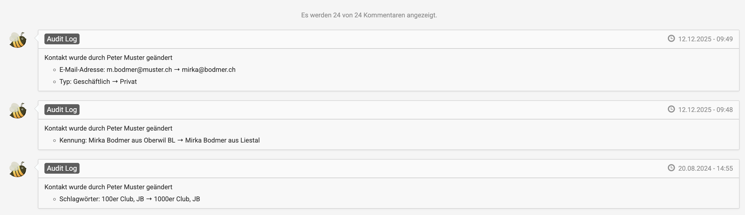 Cura protokolliert Änderungen an den Merkmalen eines Kontakts automatisch im Hintergrund. Neben Informationen zu Spendeneingängen, erstellten Briefen, manuell hinterlegten Notizen und vielem mehr werden auch alle Änderungen mit Vorher-Nachher-Ansicht im Kommentarverlauf des Kontakts mitgeführt: